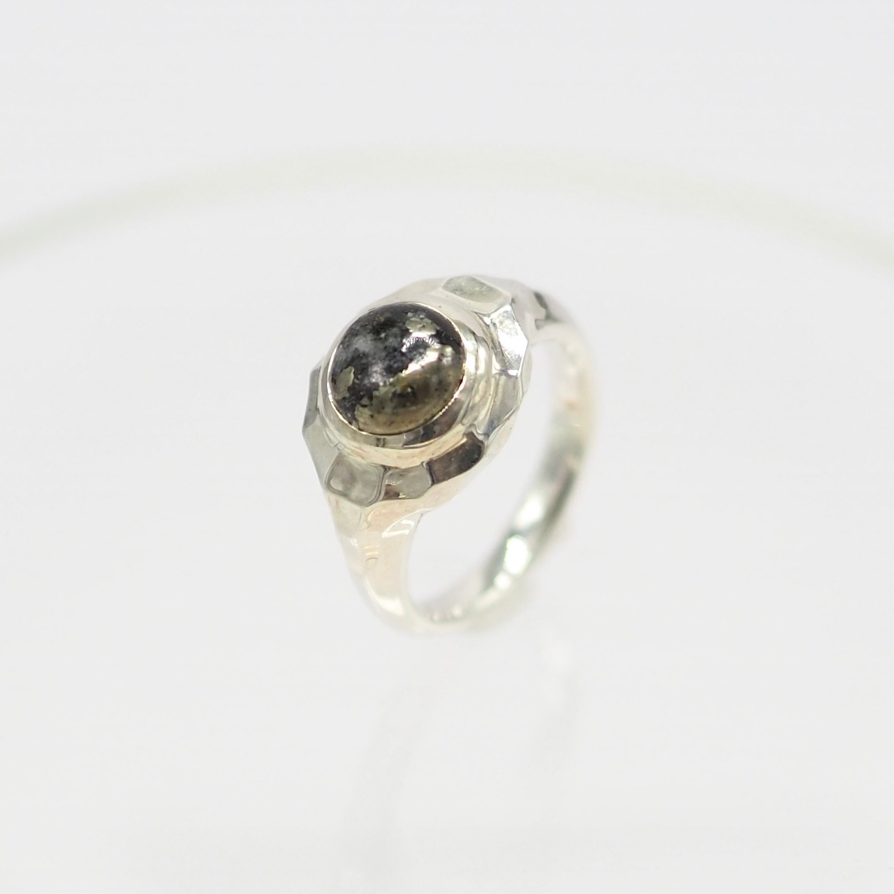石の周りはさざなみからイメージするような細かい面を作ることで、指を動かすと煌めきます