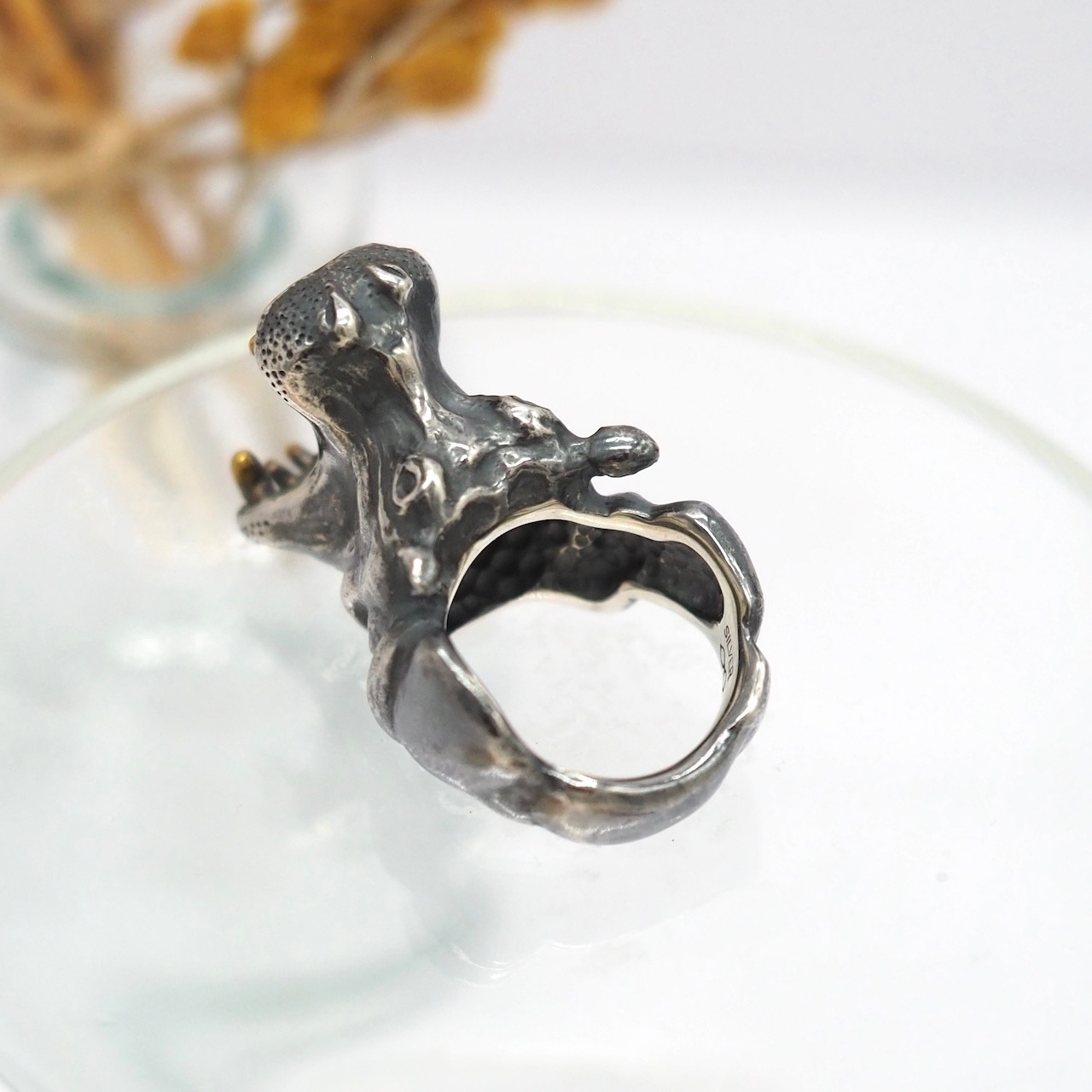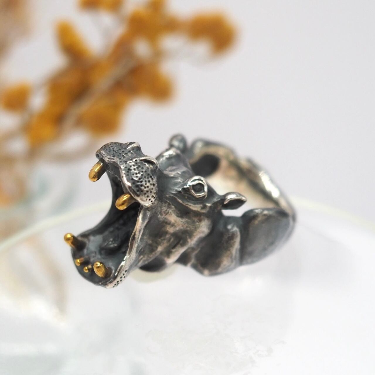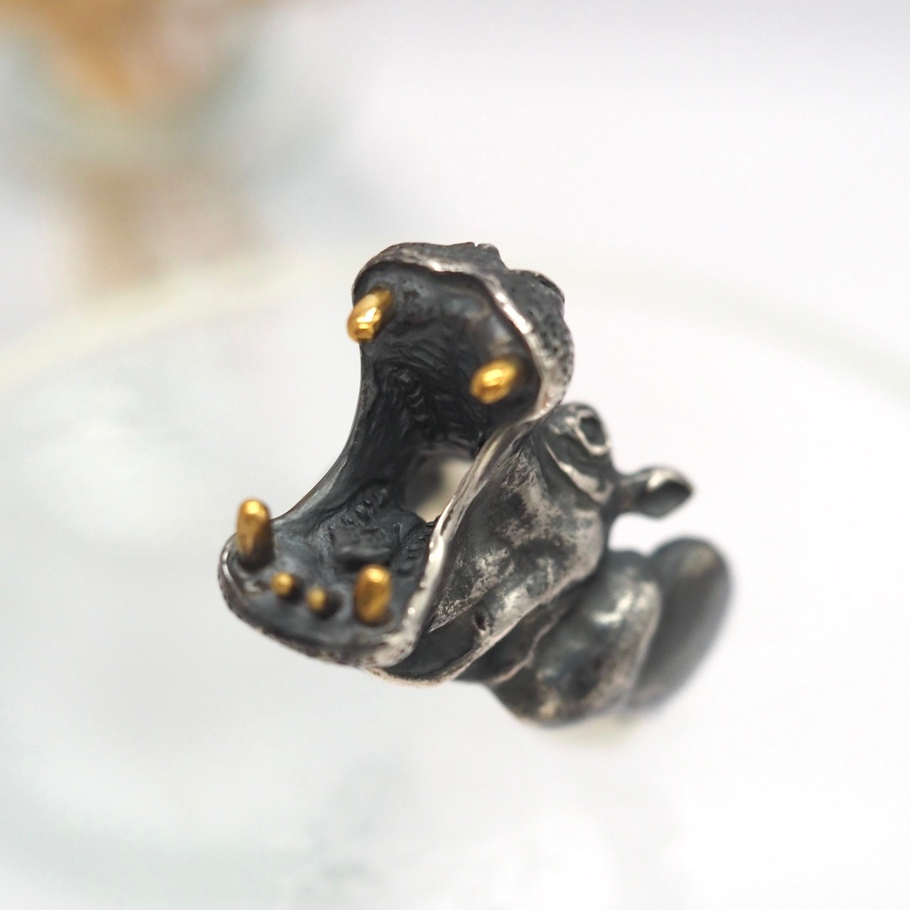 がばっと口を開けたカバのリングです