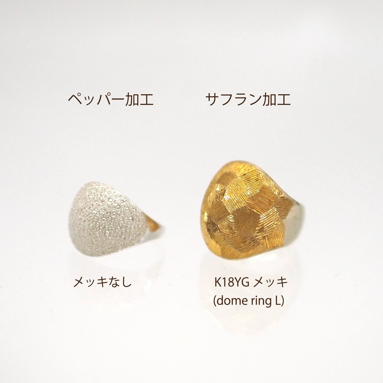 そのままのプレーン加工、ペッパー加工(つぶつぶのミル打ち)、サフラン加工(ランダムな線彫り)、つちめ加工(ハンマーで凹凸をつけたもの)をお選びいただけます。